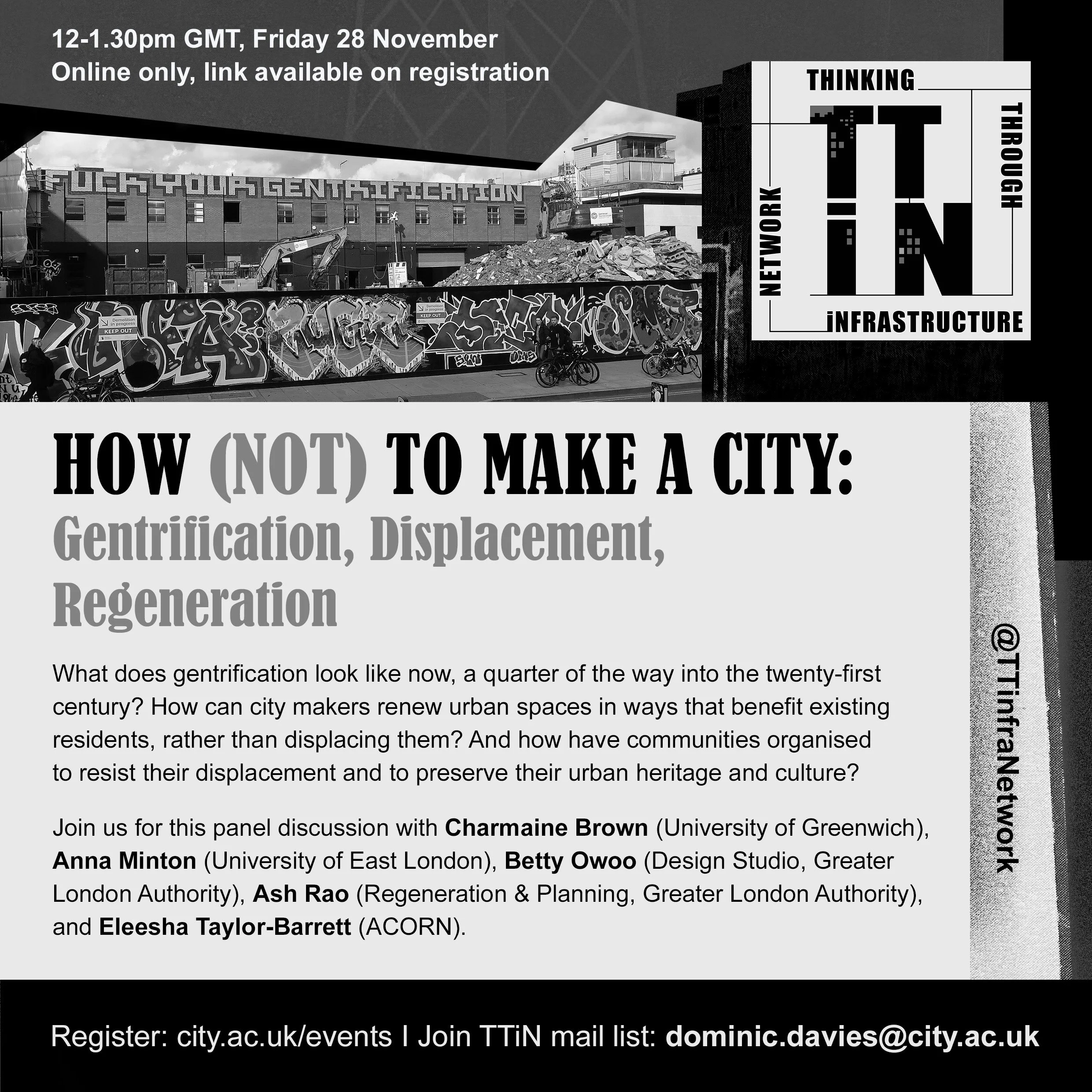 Three events hosted by the Thinking Through Infrastructure Network in Autumn 2025. Click on the link embedded into each poster for more details and to register. Follow @TTInfraNetwork on Instagram and Bluesky or contact Dom Davies to join the TTiN mail list. Poster design by Kremena Dimitrova: https://www.kremenadimitrova.com/.