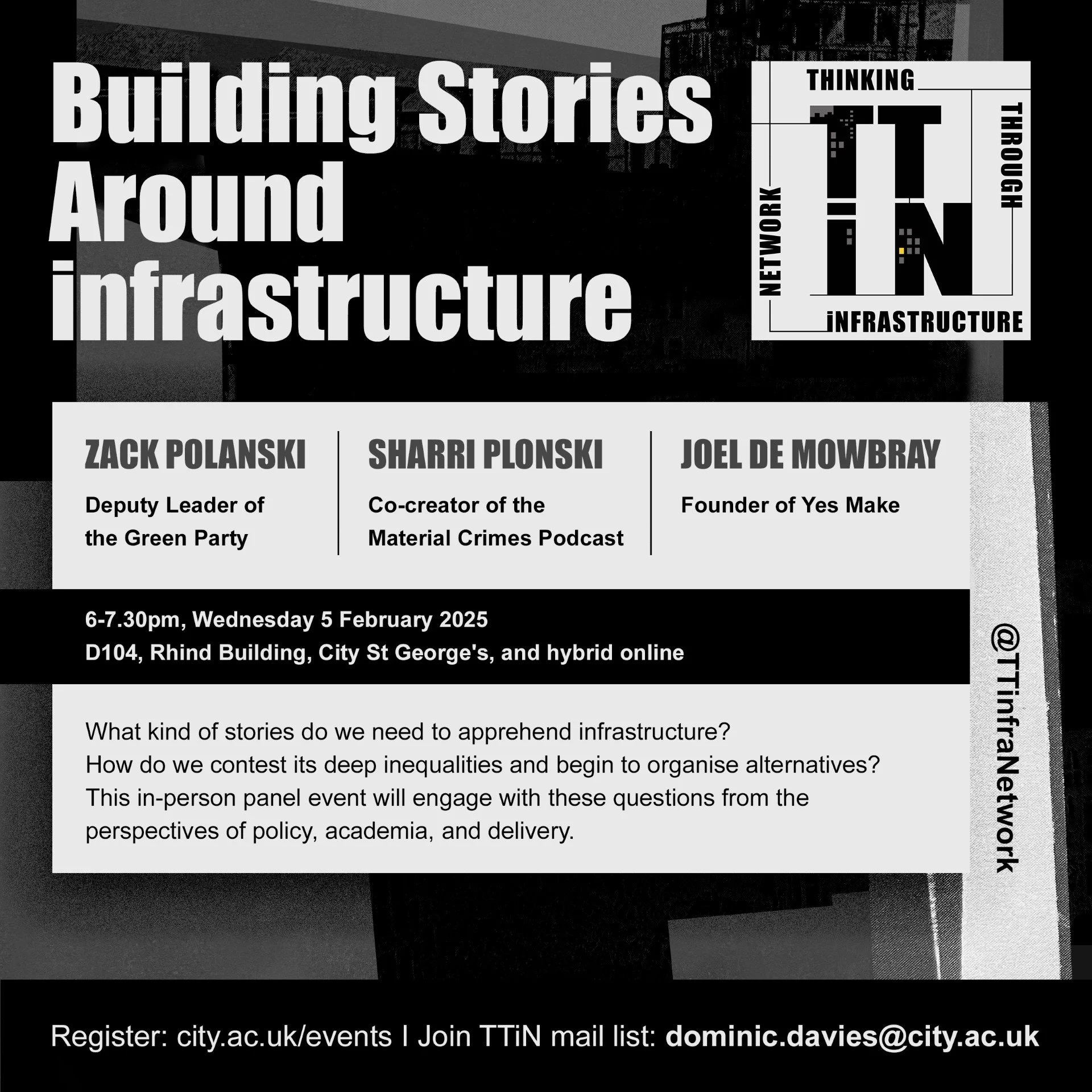 Infrastructure is comprised of systems or networks so complex that we can never see them in their physical totality. Yet they also shape the most immediate conditions of our lived experience, unevenly redistributing wealth, time, and life itself across society. What kind of stories do we need to apprehend infrastructure? How can we see it and bring it under our collective control? How do we contest its arrangement of deep inequalities and begin to organise around alternatives? Chaired by Dom Davies, this discussion is led by Zack Polanski, Deputy Leader of the Green Party and Member of the London Assembly, and Joel De Mowbray, founder of Yes Make, an infrastructure delivery organisation that specialises in empowering communities through the construction of public spaces, with members of the Thinking Through Infrastructure Network.